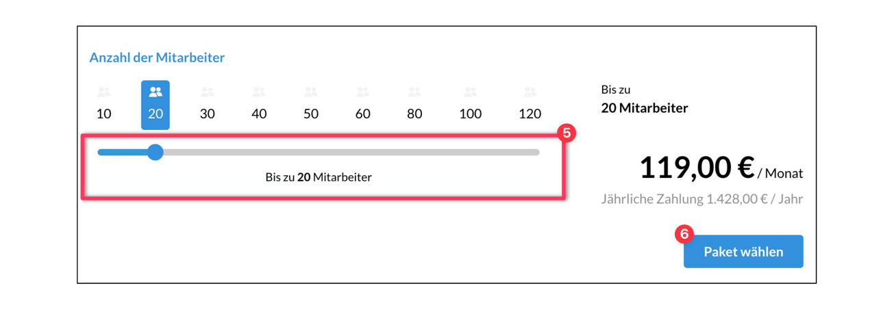 Wähle nun das passende Mitarbeiterpaket aus (5). Bitte beachte, dass Du mindestens die Mitarbeiteranzahl auswählst, die ihr auch bislang nutzt.