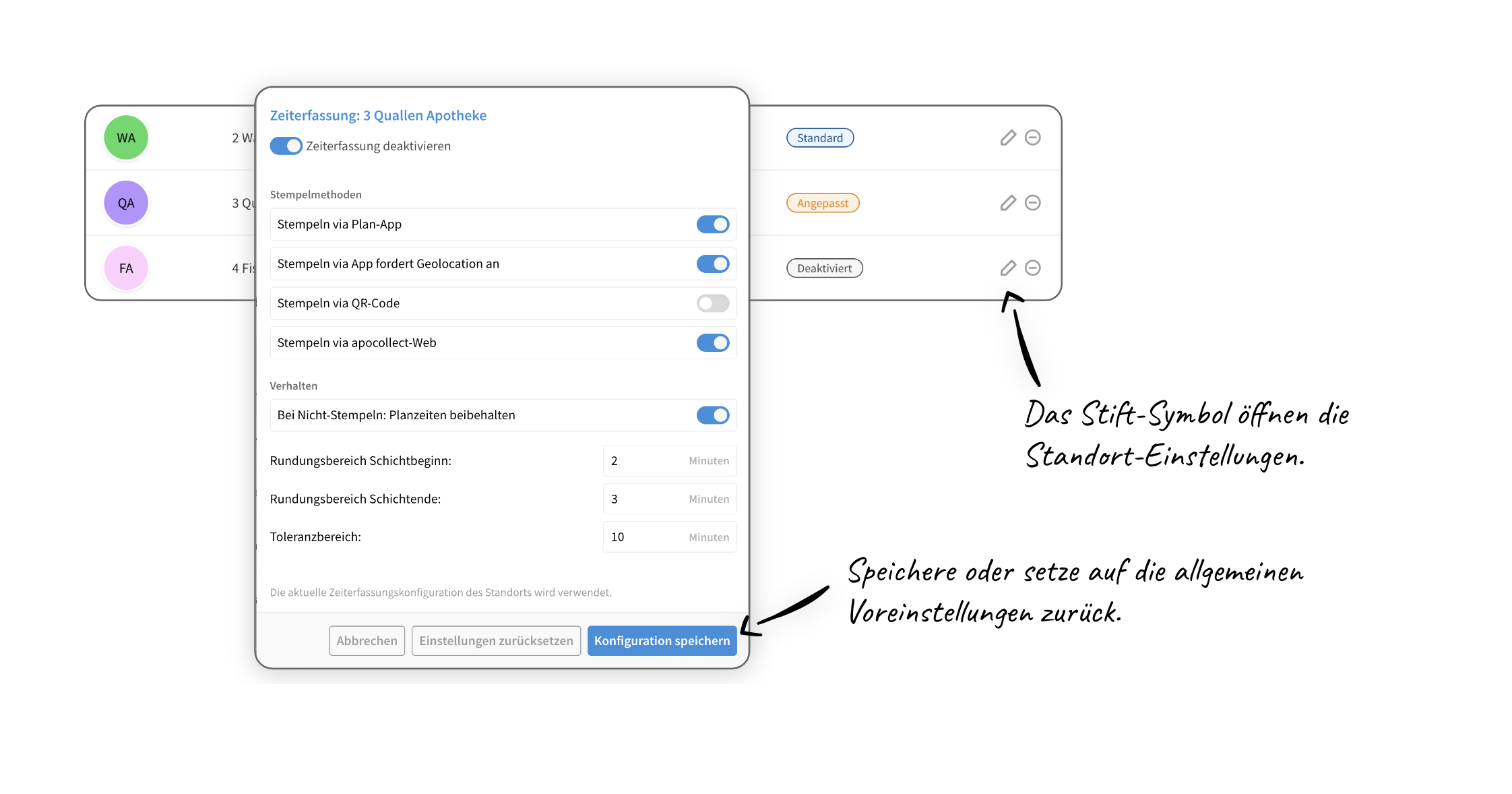 Wenn ihr mehrere Standorte angelegt habt, könnt ihr für die Mitarbeiter eines Standortes schnell die allgemeinen Zeiterfassungseinstellungen modifizieren.