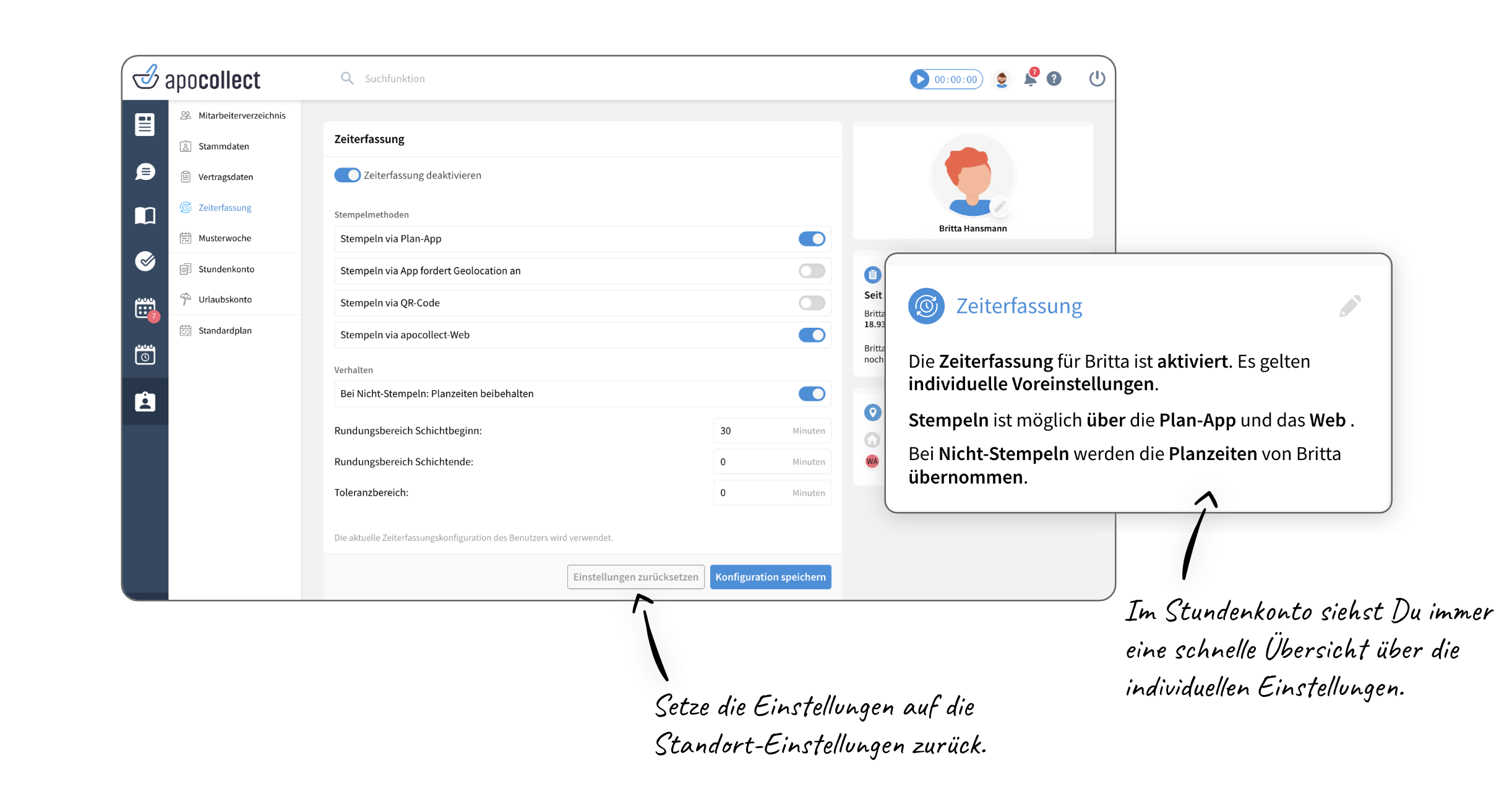 Sind für den Mitarbeiter individuelle Einstellungen hinterlegt (siehe unten), gelten die individuellen Einstellungen.