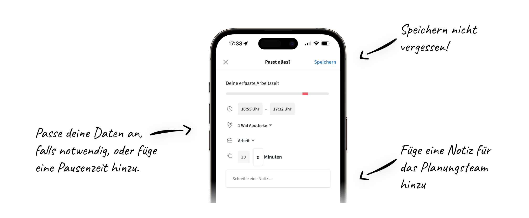 Du kannst eine Notiz für das Planungsteam hinterlegen, falls Du Dich z. B. morgens zu spät eingestempelt hast. Das Planungsteam kann deine Stempelzeiten dann nachträglich korrigieren.