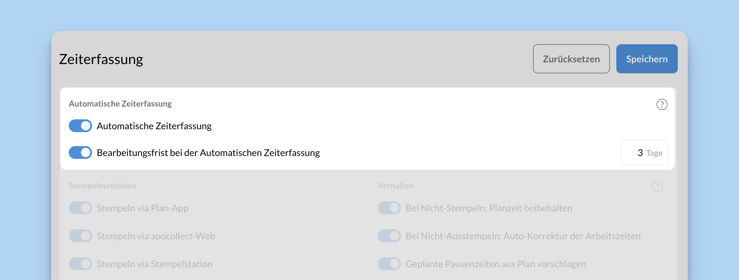 💡 Solltet ihr bislang bereits die Zeiterfassung mit Stempeln verwenden, so werden die aktuellen Stempelzeiten der Mitarbeiter für den aktuellen Tag beendet und die automatische Zeiterfassung wird für heute direkt gestartet. Alle anderen Einstellungen der Zeiterfassung werden inaktiv, da diese sich nur auf das Stempeln durch den Mitarbeiter beziehen. Die Mitarbeiter haben nun keine Möglichkeit mehr, manuell zu stempeln.