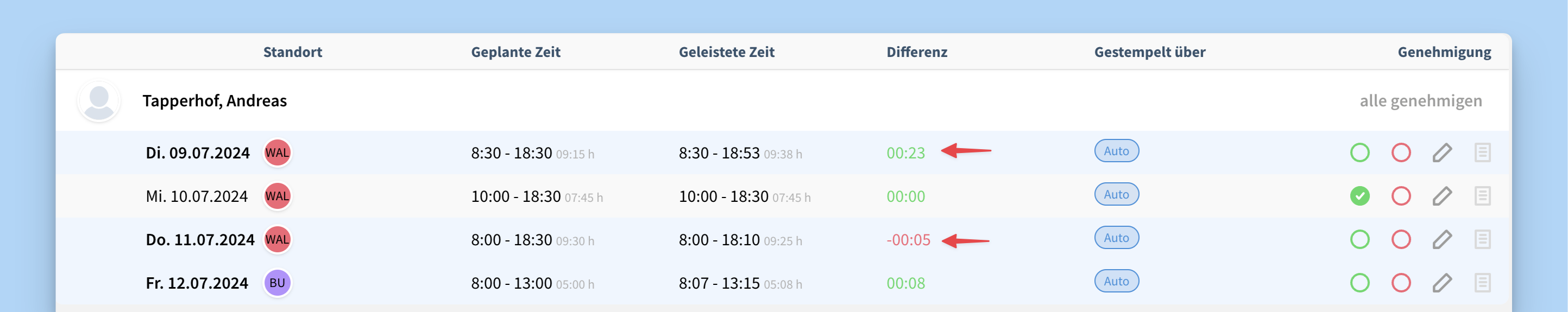 Bei einer Differenz (d. h. die tatsächliche Zeit weicht von der geplanten Zeit ab) hat der Mitarbeiter eine Änderung für diesen Tag vorgenommen (s. Pfeile in der Abbildung unten).