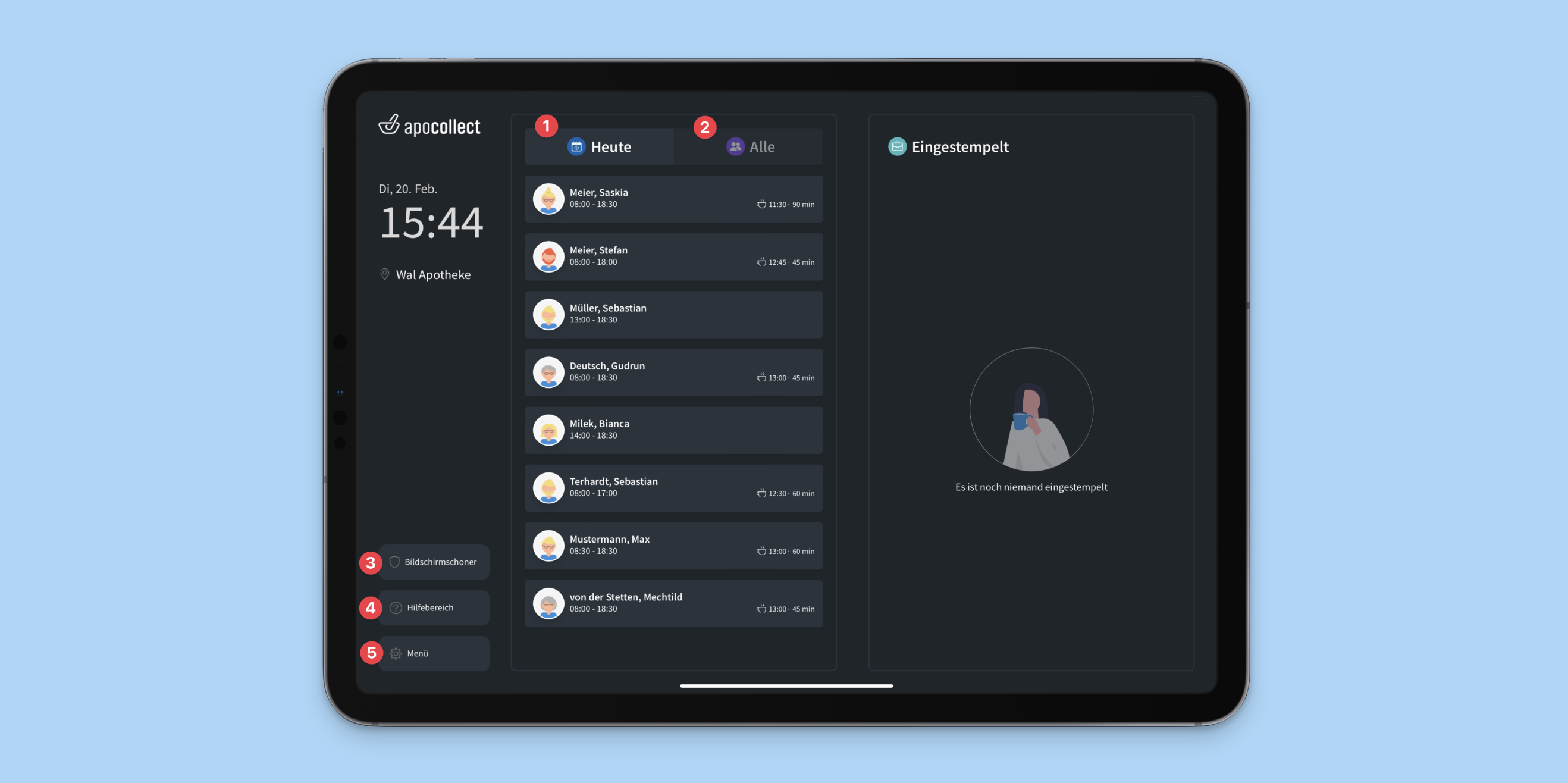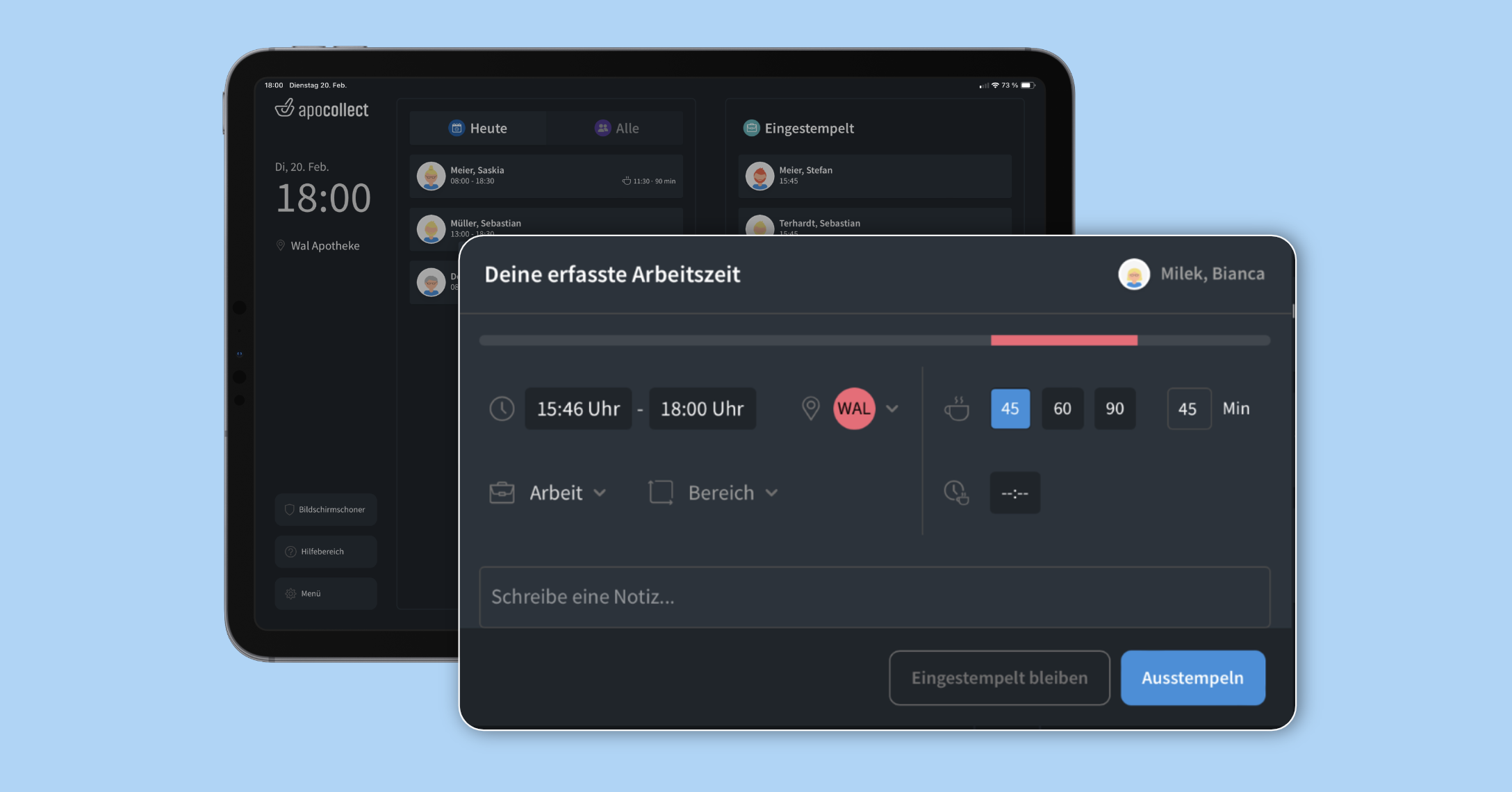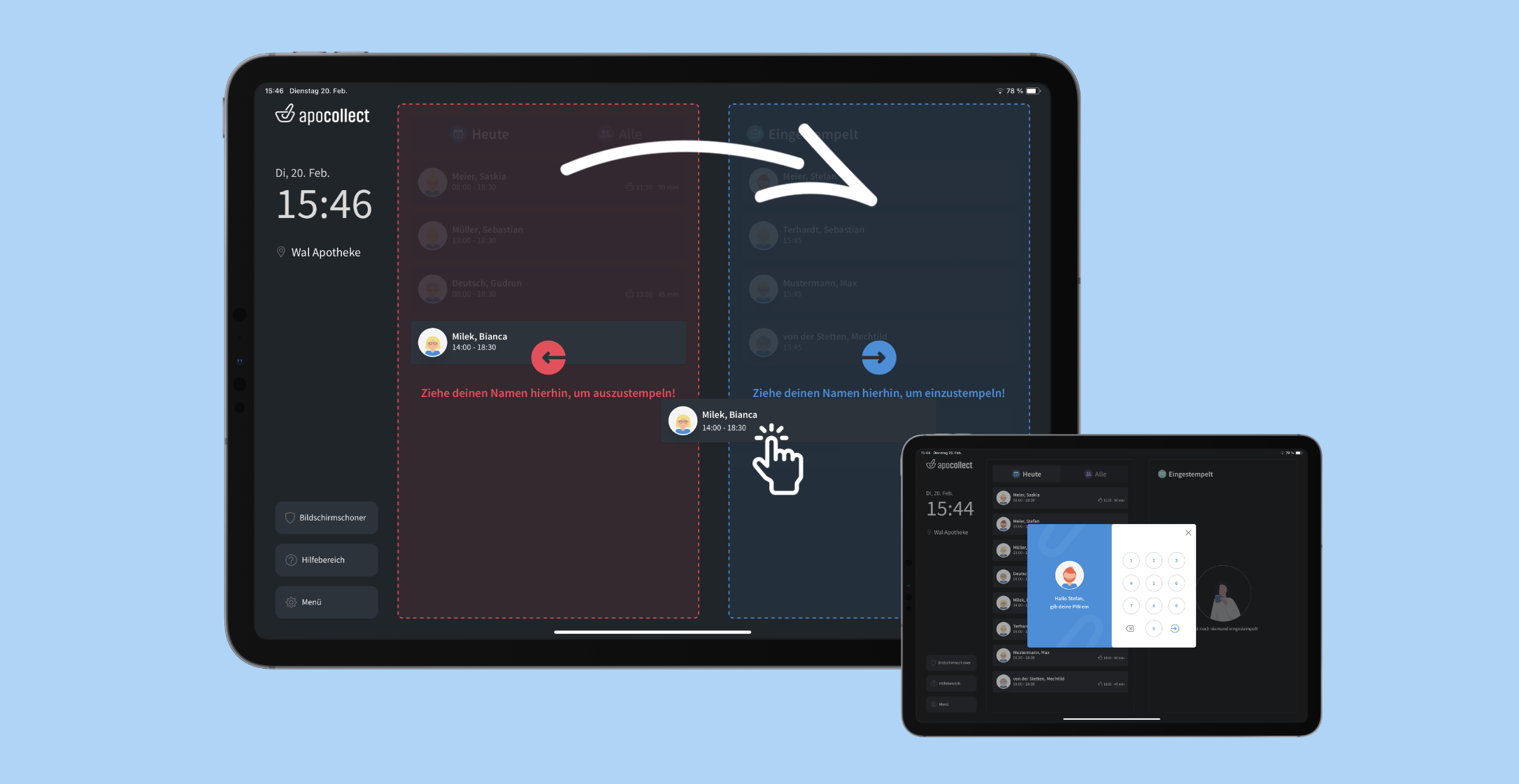 Mit der Stempelstation-App können eure Mitarbeiter bequem über Tablets per Drag & Drop stempeln. Die Tablets werden lokal in der Apotheke platziert und zum Beispiel neben die Eingangstür gehängt.