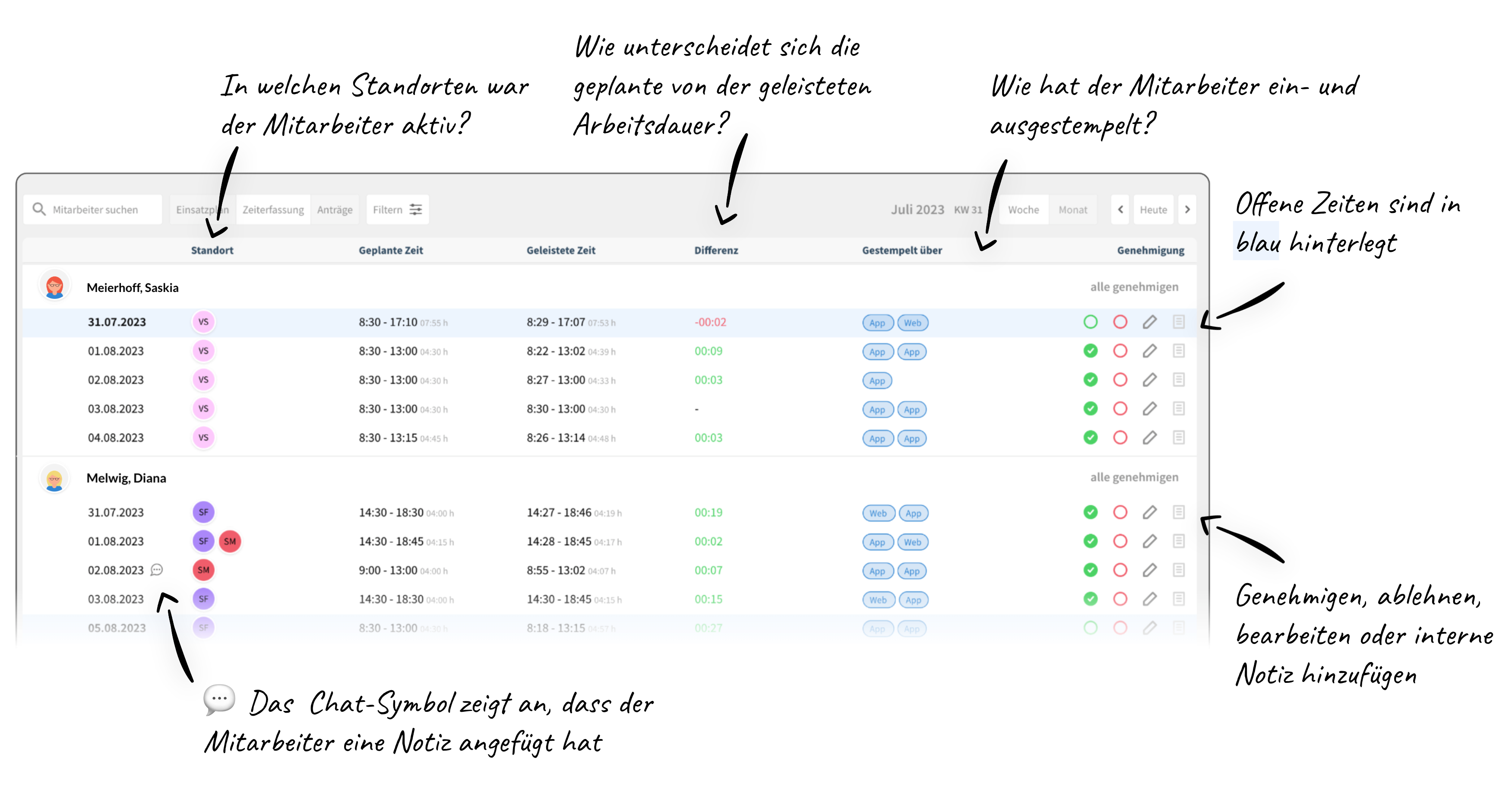 Notiz: Wenn der Mitarbeiter eine Notiz hinterlassen hat wird ein Chatsymbol angezeigt.