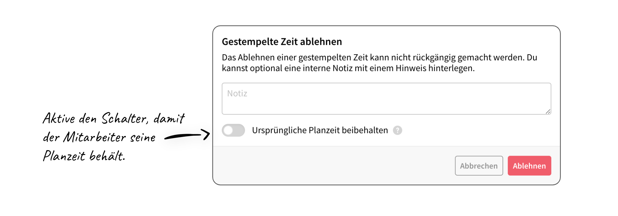 Über das rote Checkfeld kannst Du offene Einträge ablehnen. Du kannst eine Notiz hinterlassen für Dich oder andere Planer, warum Du diese Stempelzeit abgelehnt hast.