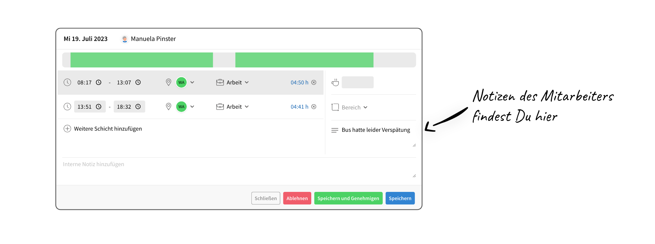 Klicke auf eine Zeile, um den Schichtenmanager zu öffnen. Du sieht alle gestempelten Zeiten und Pausenzeiten im Detail sowie Notizen, die der Mitarbeiter hinterlassen hat.