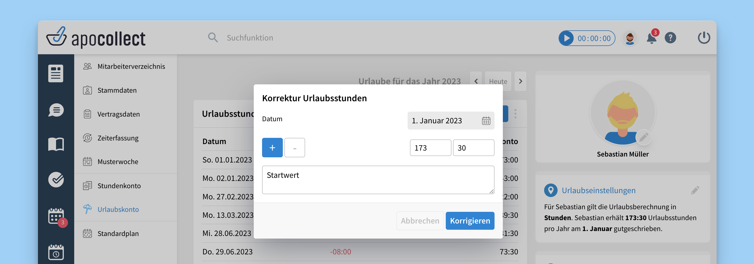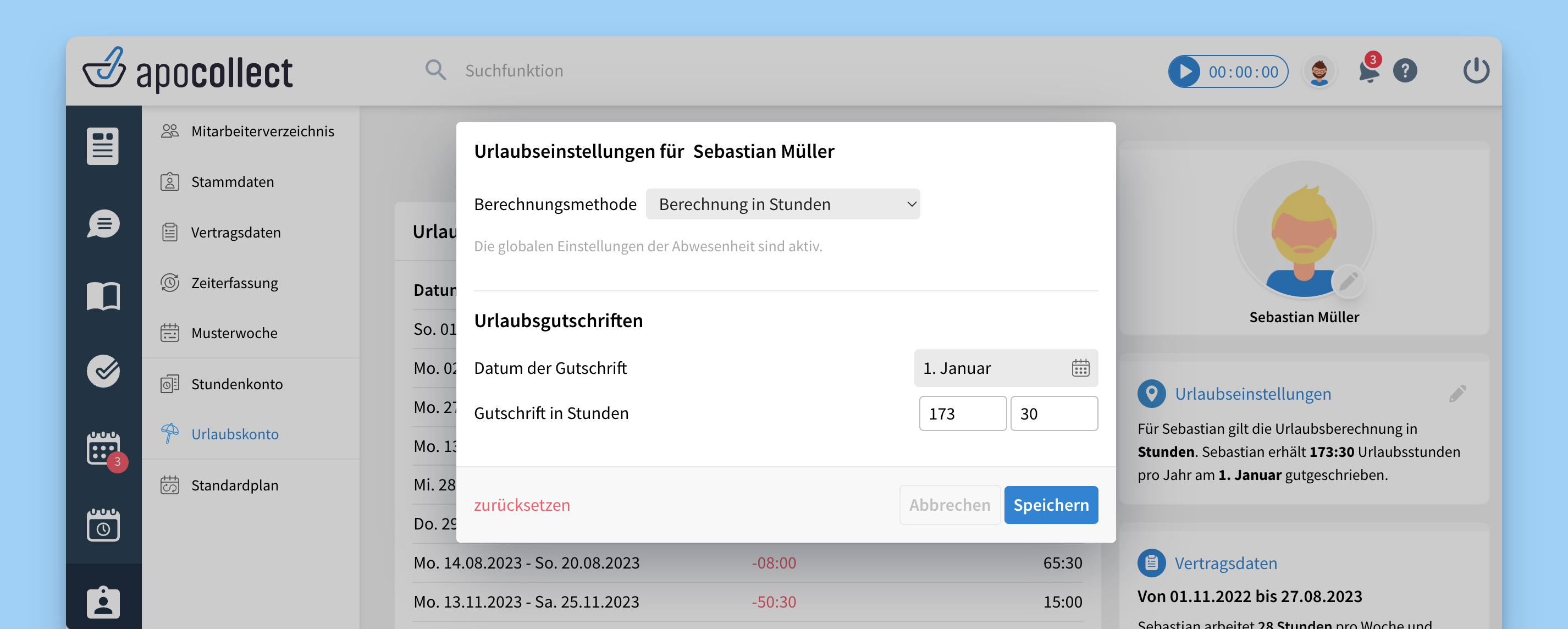 Jeder Mitarbeiter hat zukünftiges ein jährliches Guthaben an Urlaubsstunden. apocollect kann diesen Urlaubsanspruch jährlich automatisch gutschreiben.