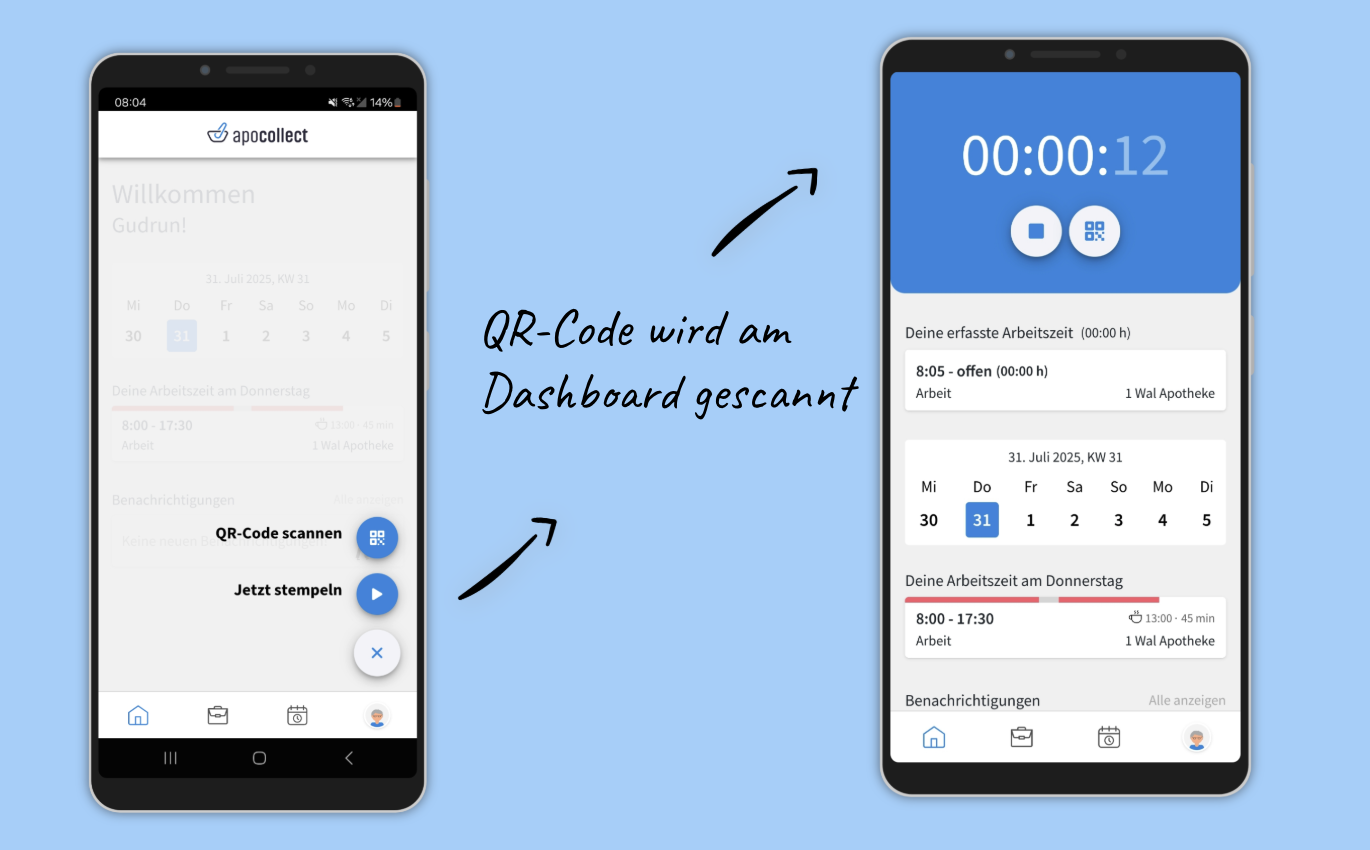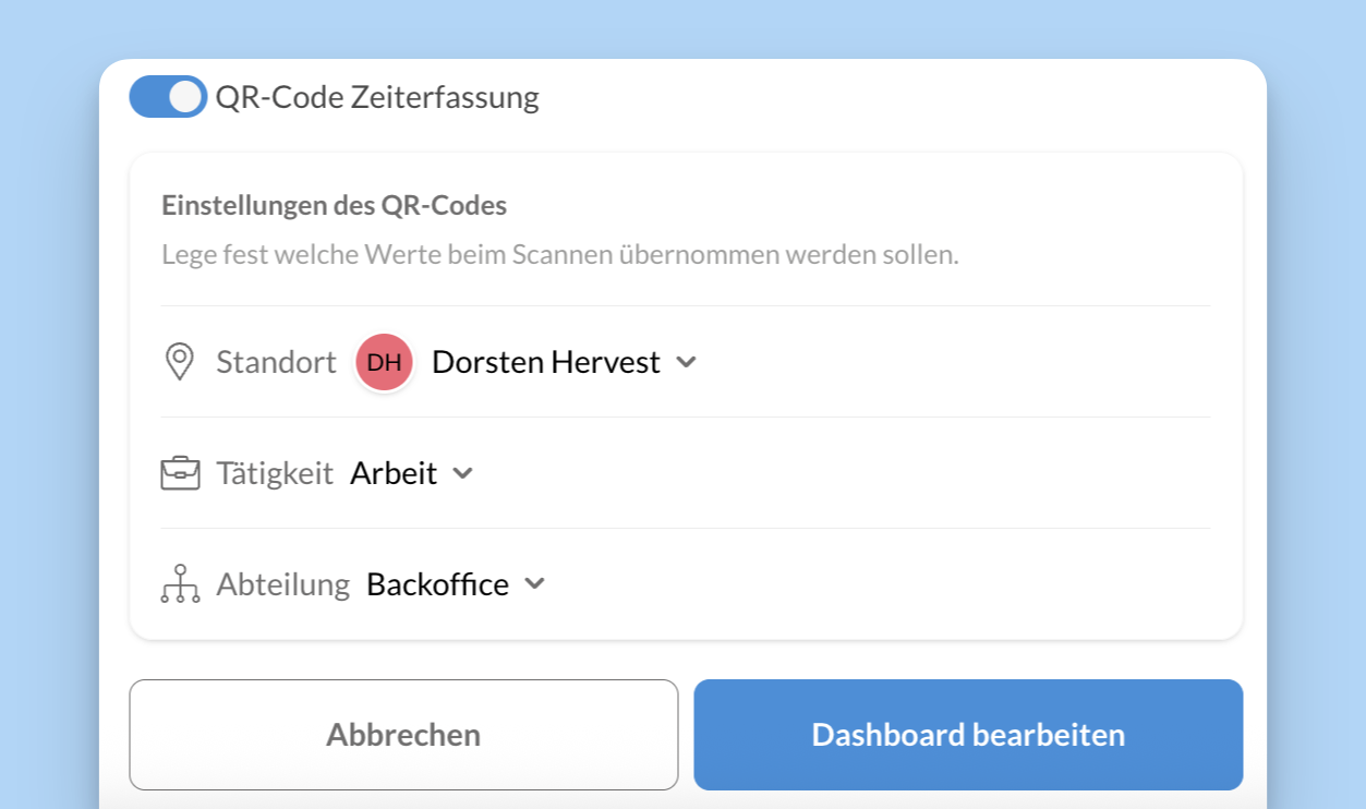 Mit dem Stempeln per QR-Code können sich eure Mitarbeiter direkt mit dem Handy am Dashboard ein- und ausloggen.