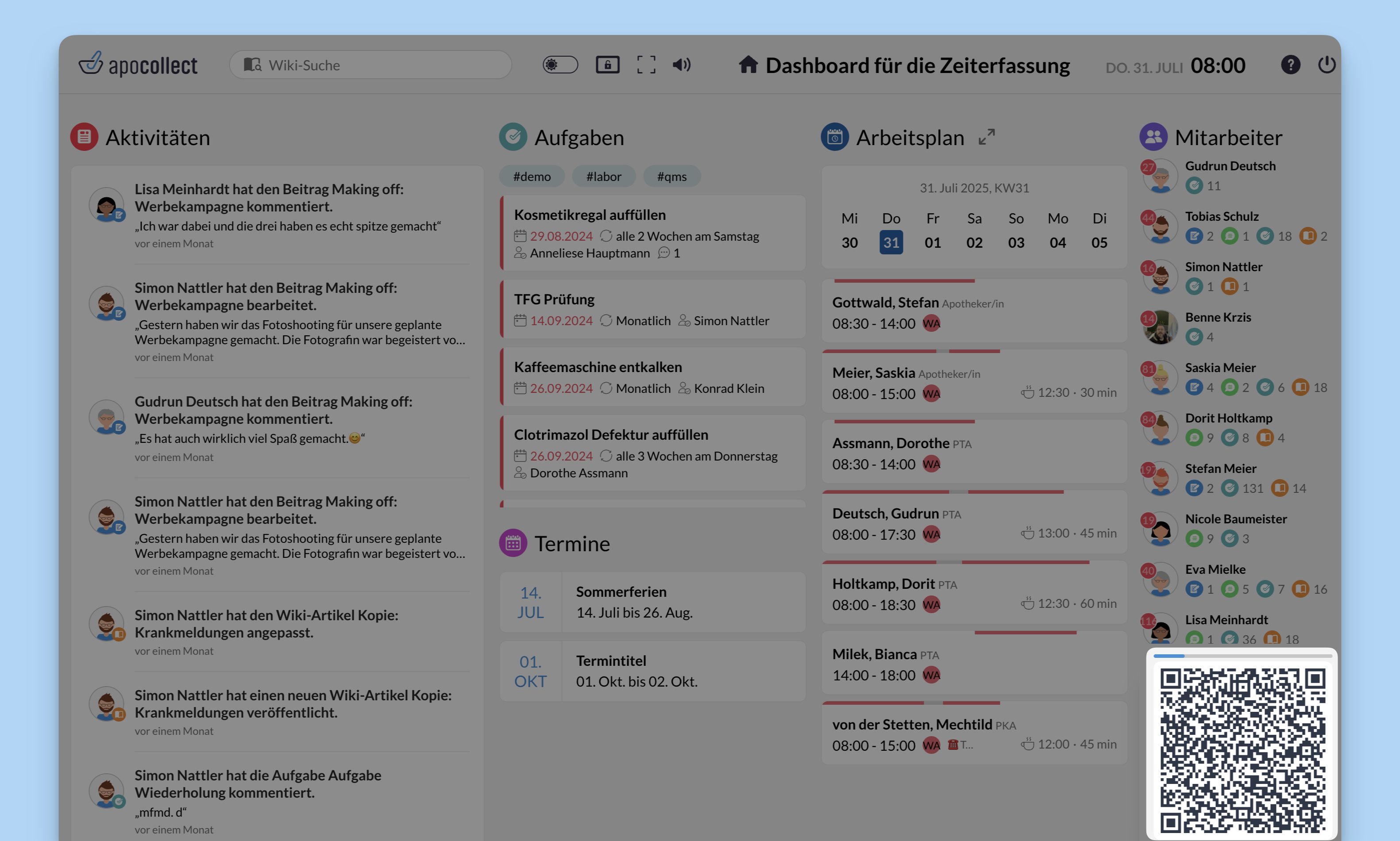 Wenn ihr das Stempeln via QR-Code für das jeweilige Dashboard aktiviert habt, erscheint unten rechts auf dem Dashboard ein QR-Code.
