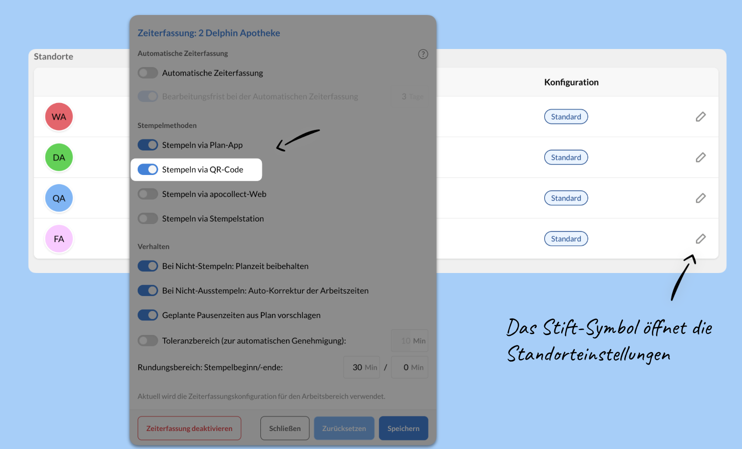 Wenn ihr mehrere Standorte angelegt habt, könnt ihr für die Mitarbeiter eines Standortes schnell das QR-Code-Stempeln aktivieren.