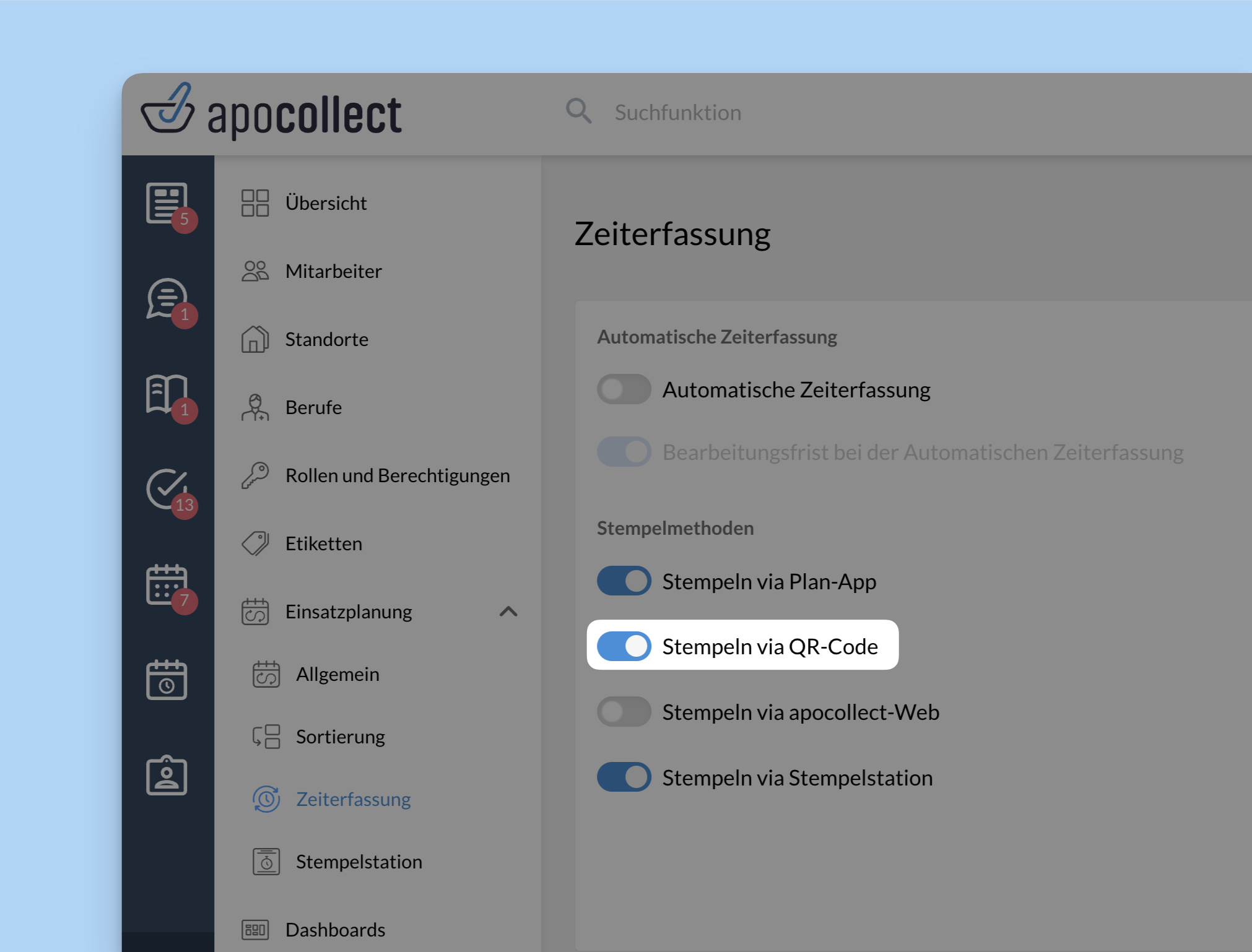 Um das Stempeln per QR-Code global für die ganze Apotheke zu aktivieren, öffnet die Administration > Zeiterfassung. Aktiviert hier anschließend die Funktion Stempeln via QR-Code. Vergesst nicht die Änderung zu speichern.