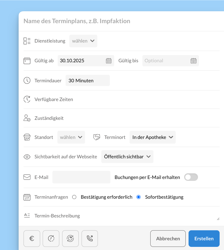 Dienstleistung | Jede Terminplan muss einer Dienstleistung zugeordnet werden. So werden ähnliche Angebote auf der Buchungsseite automatisch zusammengefasst. |